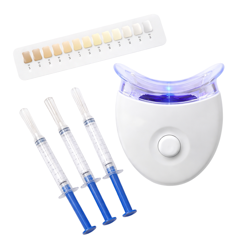 Kutunda 1 adet LED mavi ışık cihazı, aktif beyazlatma jeli (şırınga formunda), ısıtma özellikli ağız parçası ve teeth shade guide (diş rengi skalası) bulunmaktadır. Shade guide ile başlangıç renginizi kayıt altına alarak ilerlemeyi takip edebilirsiniz.