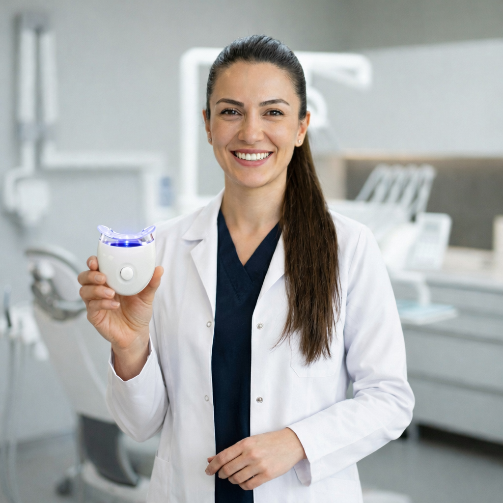 Günde 1 seans, 10 dakika yeterlidir. Jeli ağız parçasına uygula, LED cihazı tak ve 10 dakika bekle. Aşırı kullanım gerekli değildir — klinik etki için önerilen süre ve frekans bu kadardır.